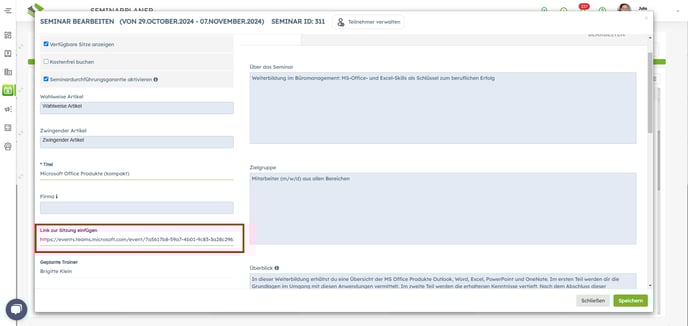 Externer Meetinglink für Online Seminare im Seminarplaner