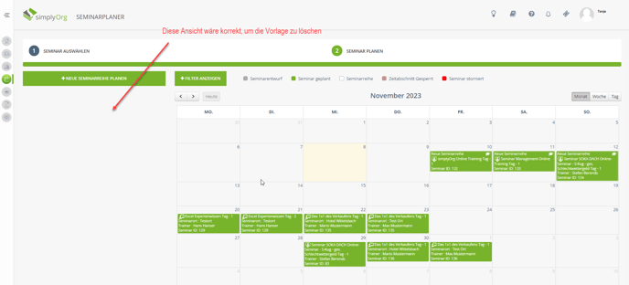 Dann kann die Seminarreihenvorlage gelöscht werden:
