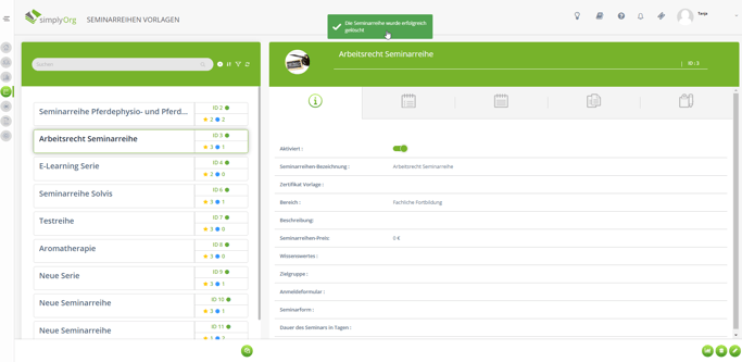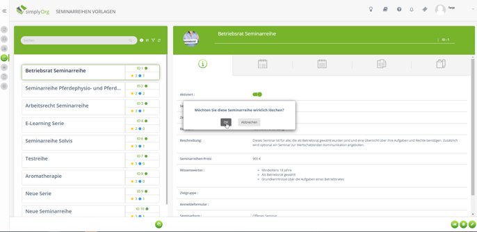 Fehlermeldung "Seminarreihe kann nicht gelöscht werden", beim Versuch eine Seminarreihenvorlage aus simplyOrg zu löschen