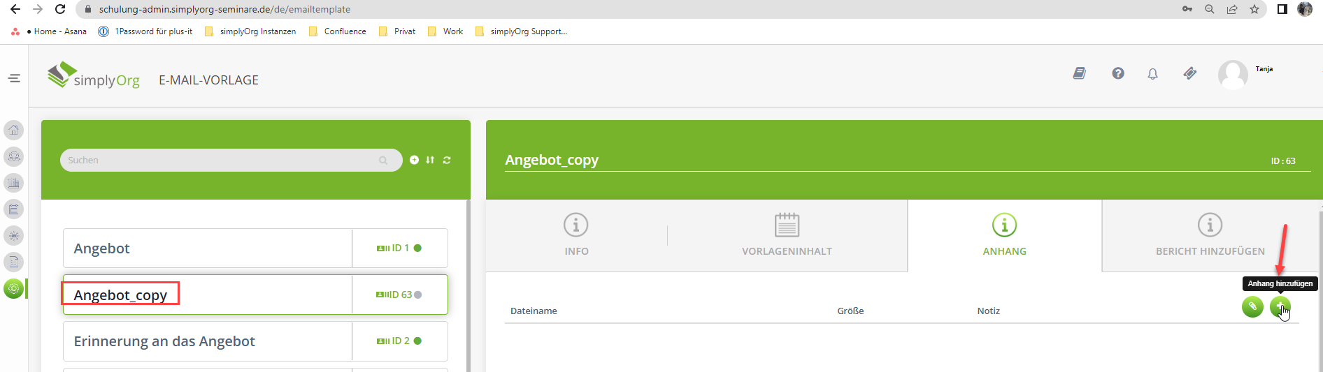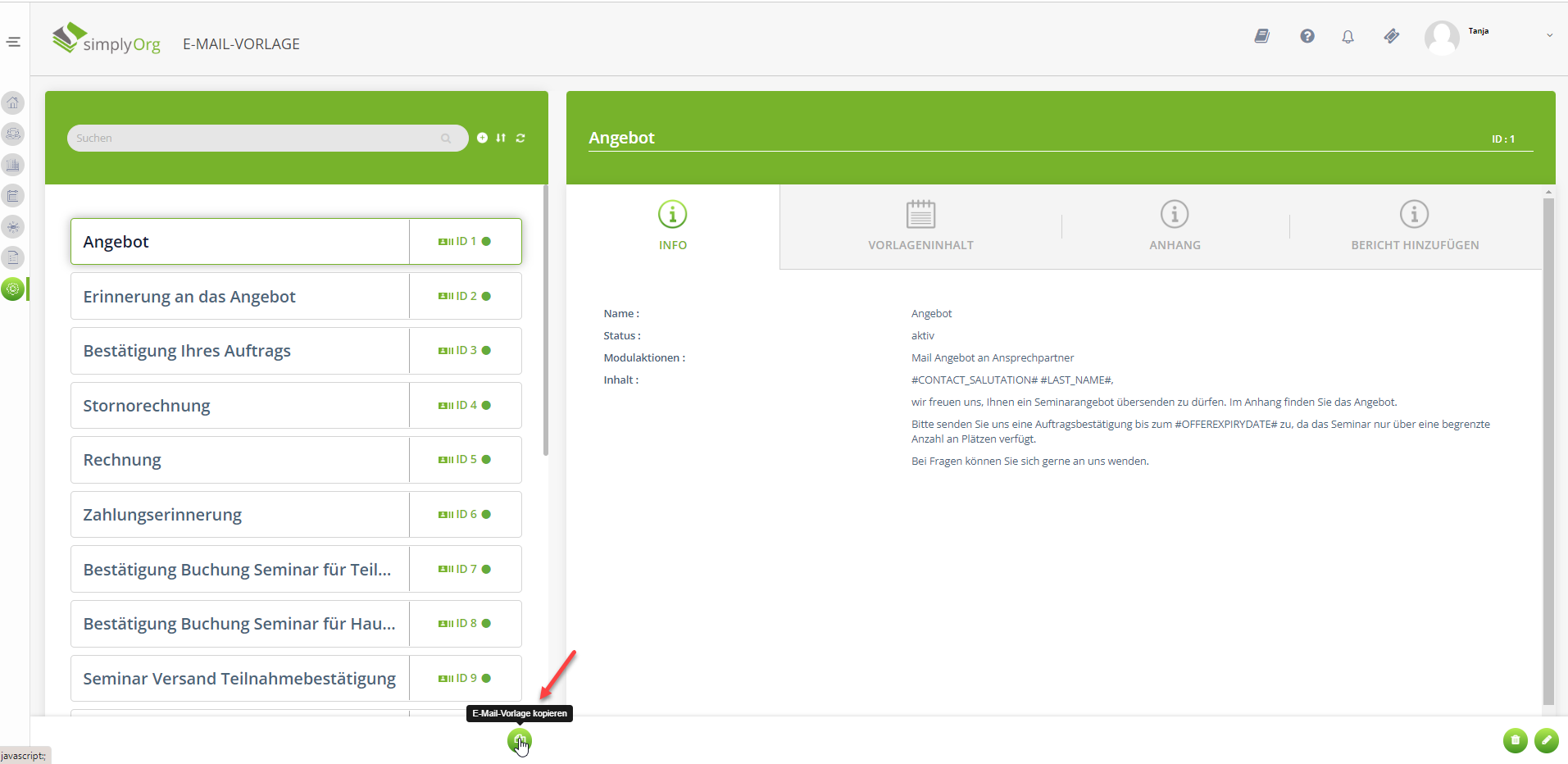 Wird eine E-Mail-Vorlage kopiert, so wird der Anhang der ursprünglichen E-Mail-Vorlage nicht automatisch mit in die Kopie übernommen. Für die neue, kopierte E-Mail-Vorlage muss der gewünschte Anhang manuell hinzugefügt werden.
