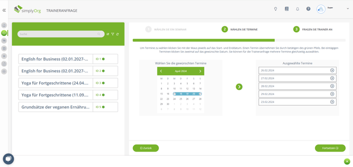 Für die Auswahl von Zeitpunkten und Zeiträumen für die Traineranfrage gehen Sie bitte folgendermaßen vor: