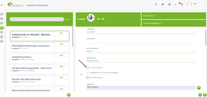 Grundsätzlich können für Inhouse Seminare Rechnungen erstellt werden ohne, dass Teilnehmer ausgewählt sind. Wenn das Seminar in der Seminar Vorlage oder spätestens im Seminar Planer mit der Checkbox “Inhouse Seminar” versehen ist, wird das Seminar im Buchhaltungsmodul nicht unter “geplante Seminare”, sondern unter “Inhouse Seminare” aufgelistet. Wenn man dies dort auswählt, kann man eine Rechnung erstellen, ohne Teilnehmer hinzufügen zu müssen.