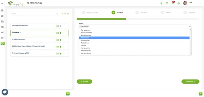 Einstellungen und Ansicht in den Preisregeln für Rollen