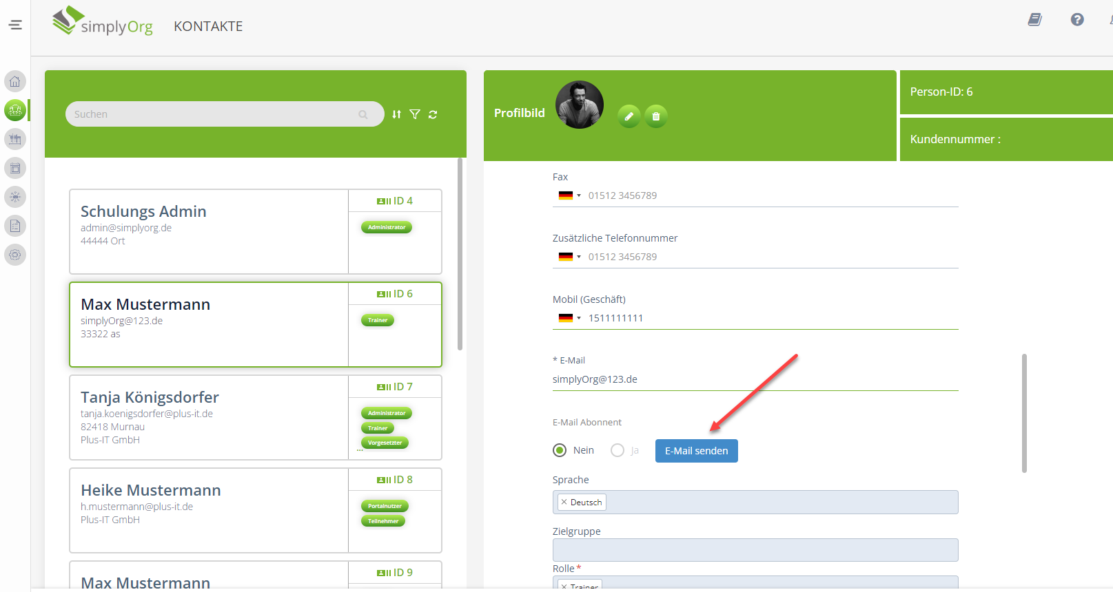 -> Im Kontaktmodul unten rechts auf das "Bearbeiten" Symbol klicken und im Feld "E-Mail-Abonnent" auf "E-Mail senden" Button klicken. Der entsprechende Kontakt erhält eine E-Mail mit einem Bestätigungslink. Hat der Kontakt diesen bestätigt, ist er ab sofort ein E-Mail-Abonnent.