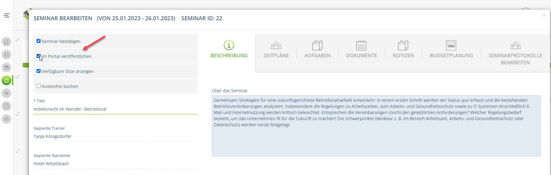 Im Modul “Seminar Planer” gibt es die Möglichkeit ein bereits geplanes Seminar nachträglich zu bearbeiten. Durch einen Links-klick auf das gewünschte Seminar öffnet sich ein Register. Wählt man dort “Seminar bearbeiten” aus, öffnet sich ein neues Fenster. Oben links erscheint unter anderem die Checkbox “Im Portal veröffentlichen”. Diese ist in der Voreinstellung nicht ausgewählt. Erst durch auswählen dieser Option und anschließendem Speichern wird das Seminar nun erfolgreich im Online Portal angezeigt.