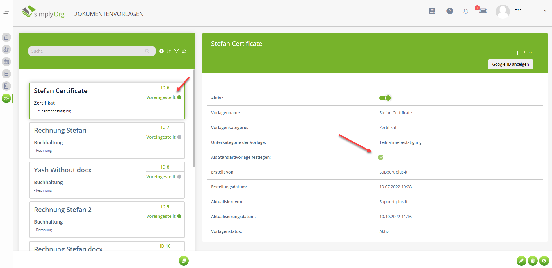 Wird in der Registrierung für Seminare ein Zertifikat eines anderen Seminares angezeigt, so liegt dies daran, dass in der Administration unter "Dokumentenvorlagen" ein Standardzertifikat/Teilnehmerbestätigung als Standardvorlage ausgewählt ist.