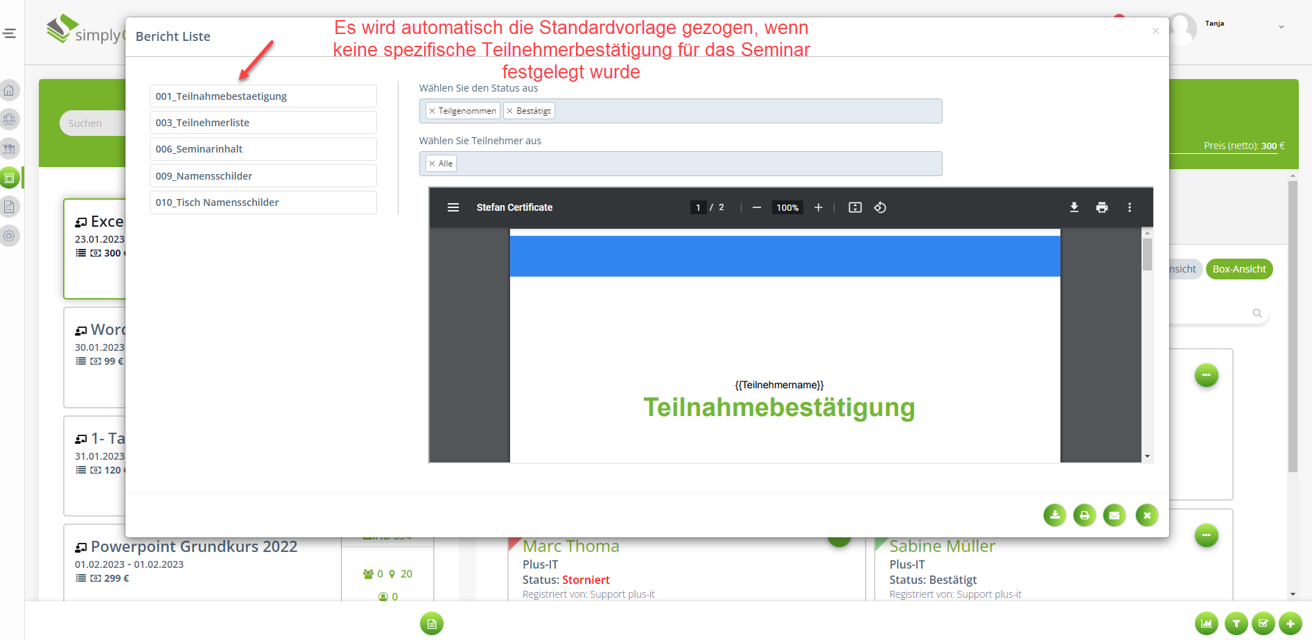 Über "Bericht" Button generierte Teilnehmerbestätigung zeigt nicht die gewünschte Teilnehmerbestätigung an.