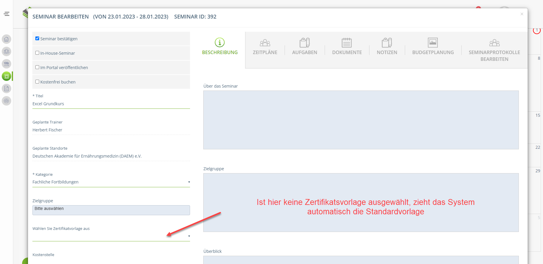 Ist dann in der Seminarvorlage oder direkt beim geplanten Seminar keine spezifische Teilenehmerbestätigung ausgewählt, zieht das System die Standardvorlage.