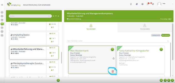Rotes Icon im Modul "Registrierung für Seminare" bei Teilnehmern unten rechts.
