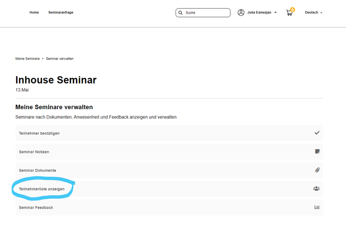 Ein Trainer bzw. Vorgesetzter kann in seinem persönlich Login Bereich die Teilnehmerliste als Bericht sehen.