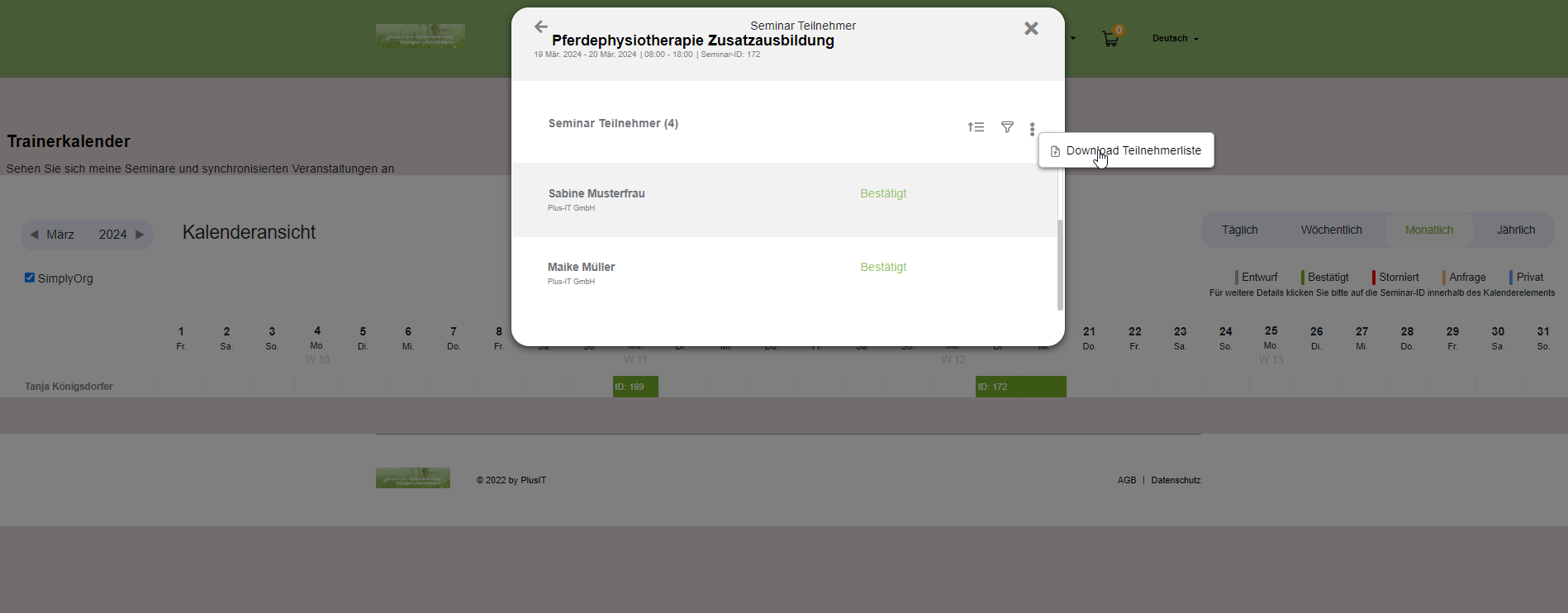 Das Herunterladen der Teilnehmerliste ist über den Menüpunkt "Trainerkalender" möglich: