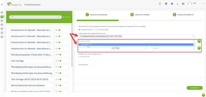 Bei der Erstellung einer Traineranfrage, kann im Tab 1 ein geplantes Seminare ausgewählt werden. Direkt darunter befindet sich das Feld "Seminarort". Hat man einen geplanten Termin ausgewählt und klickt in das Feld "Seminarort", zeigt das System automatisch den im Seminarplaner für dieses Seminar hinterlegten Ort an: