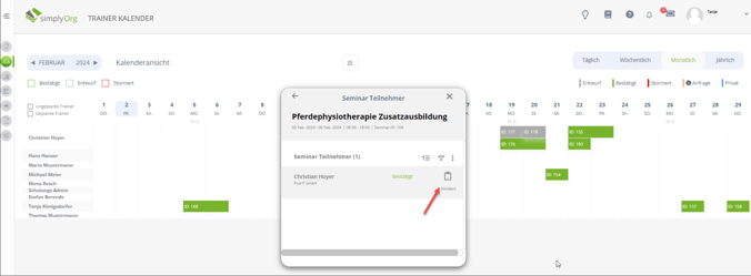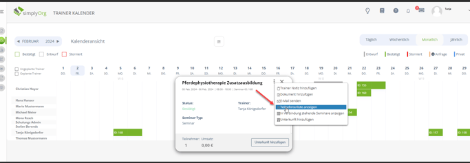 Als simplyOrg Backend User kann diese Notiz im Backend im Trainer Kalender angesehen werden. Dazu bitte das Seminar auswählen, oben rechts auf das 3-Punkte Symbol klicken und “Teilnehmerliste anzeigen” auswählen.