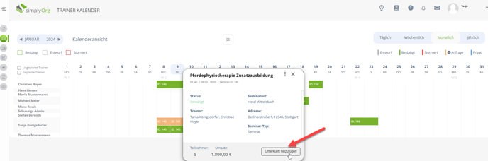 Wie kann ich den Trainer informieren, wenn ich ihm eine Unterkunft über den Trainerkalender hinzugefügt habe?