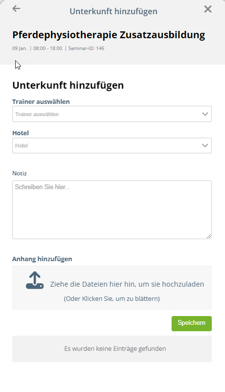 Um den Trainer per E-Mail über seine Unterkunft/sein Hotel zu informieren, muss in der Administration unter dem Menüpunkt "Trainer Einstellungen" die Checkbox "E-Mail senden, wenn ein neues Unterkunftsdetail hinzugefügt wurde" ausgewählt werden. Wird dem Trainer eine Unterkunft über den Trainer Kalender hinzugefügt und der Vorgang gespeichert, erhält der Trainer diese Information per Mail: