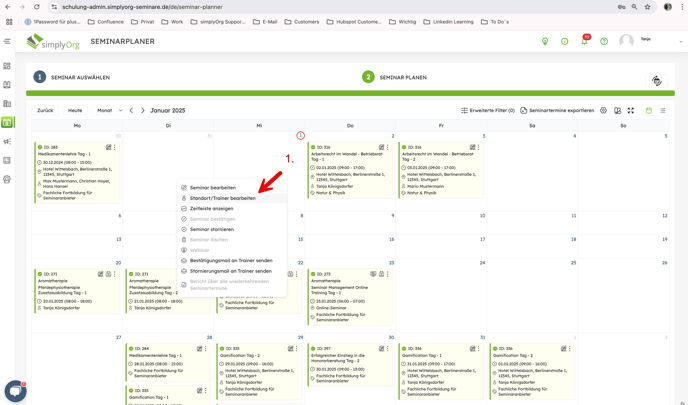 • Navigieren Sie zum Seminarplaner und suchen Sie das geplante Seminar, bei dem der Trainer geändert werden soll. -