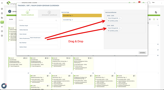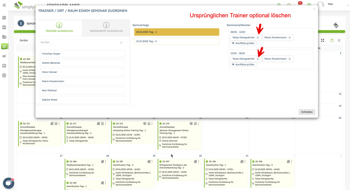 Das Ändern des Trainers in einem bereits geplanten Seminar und die anschließende Benachrichtigung an den Trainer ist einfach durchführbar. Befolgen Sie die folgenden Schritte:
