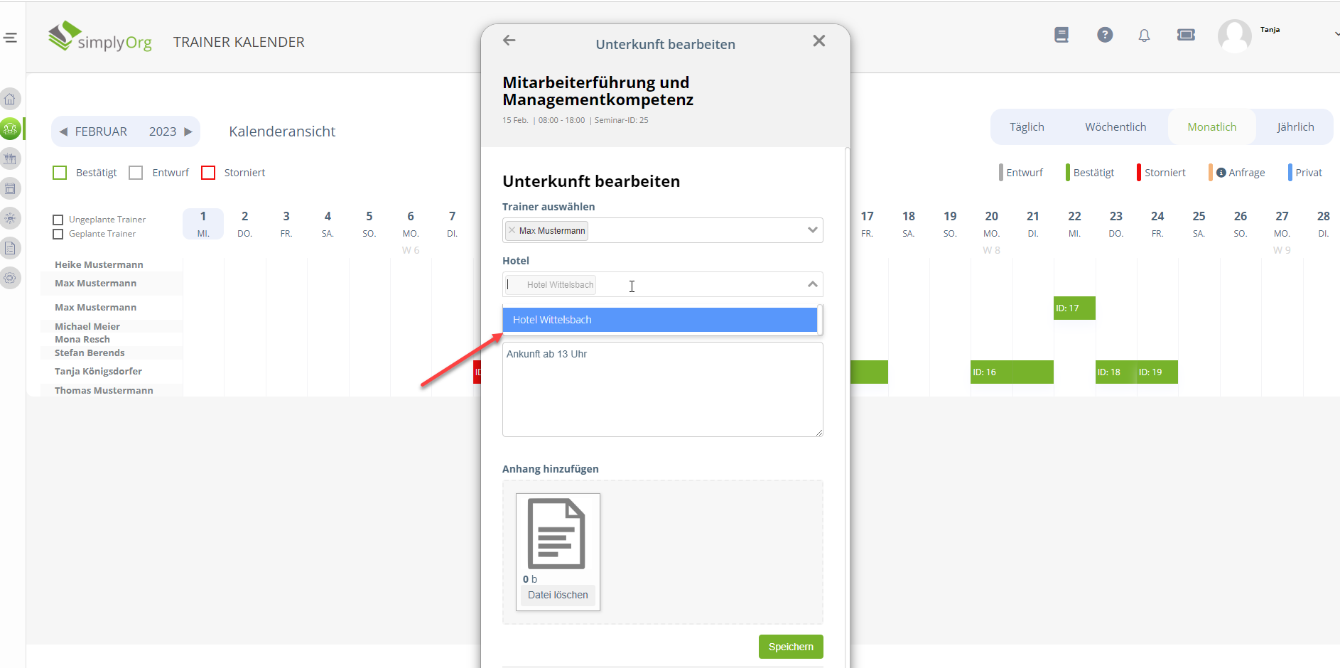 Hierfür muss im Modul "Organisationen" das entsprechende Hotel mit dem Organisationstyp "Hotel" angelegt werden. Ist dieses dann gespeichert, so wird das Hotel im Trainerkalender bei Hinzufügen einer Unterkunft im Dropdown angezeigt.