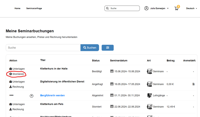 Prozess der Stornierung eine Seminares durch den Teilnehmer