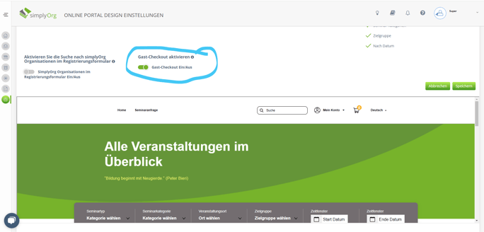 Wie kann man in simplyOrg den Gastcheckout aktivieren? Gastcheckout aktivieren in simplyOrg. Der Gastcheckout ist aktivierbar im simplyOrg Backend in der Administration unter dem Menüpunkt "Online Portal Design Einstellungen".