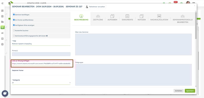 Grundsätzlich kann im Backend von simplyOrg eingestellt werden, ob ein externer Meetinglink für Online Seminare verwendet wird oder eine direkte Verbindung zu Online Seminar Plattformen stattfindet (zoom, Webex, MS Teams oder GoToWebinar). Wenn in den Online Seminar Einstellungen die Option "Externer Meetinglink" eingestellt ist, gibt es ein Pflichtfeld ("Link zur Sitzung einfügen") im Modul "Seminar Planer" wo der Link eingefügt werden muss. Es wird in jedem Fall ein Link zu einem Online Seminar verschickt.