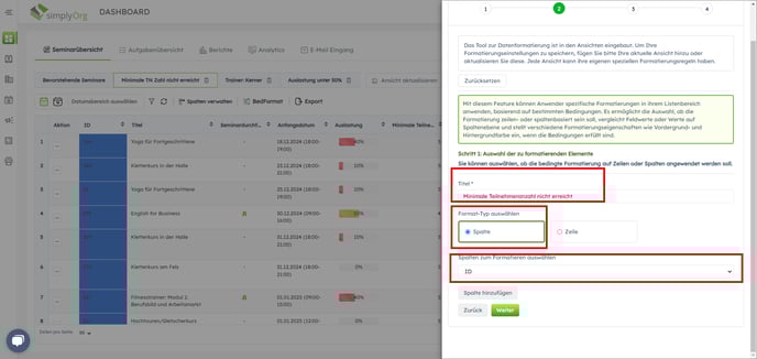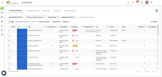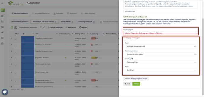 So erstellen Sie die Ansicht für Seminare, deren Mindestteilnehmeranzahl nicht erreicht ist: