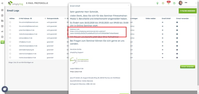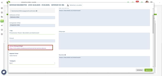 Externer Meeting Link in Bestätigungs-E-Mails für Online Seminare