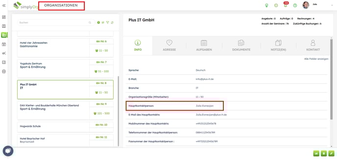 Wo findet man die Hauptkontaktperson einer Organisation? Hauptkontakt einer Organisation Die Hauptkontaktperson von Organisationen ist zu finden im Organisationsmodul.