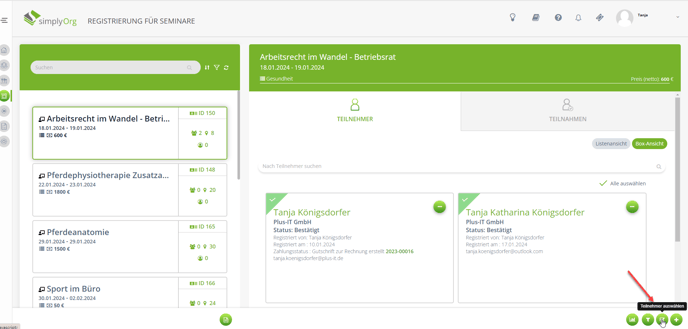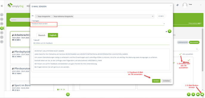 1. Es ist möglich, Feedback Formulare über das Modul "Registrierung für Seminare zu versenden". Mit Klick auf "Teilnehmer auswählen", können alle oder nur bestimmte Teilnehmer ausgewählt und anschließen die Mail mit dem angehängten Feedback Formular versendet werden.