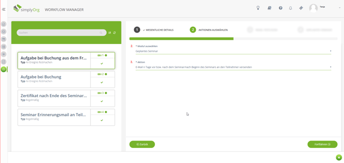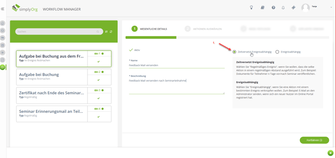 2. Eine weitere Möglichkeit ist die Verwendung eines Workflows (Administration - Workflow Manager). Hier kann ein neuer Workflow angelegt werden und dann die Mail mit dem Feedback automatisch versendet werden. Bitte als Workflowtyp "Zeitversetzt Ereignisabhängig" auswählen und das Modul "Seminar Registrierung" wählen.