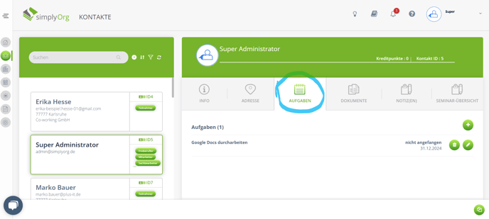 Wo kann man Aufgaben unabhängig von einem Seminar hinzufügen ? Anlegen von Aufgaben, die seminarunabhängig sind. Das Anlegen von Aufgaben ohne Bezug auf ein Seminar ist im Kontakt,- Trainer oder Organisationsmodul möglich.