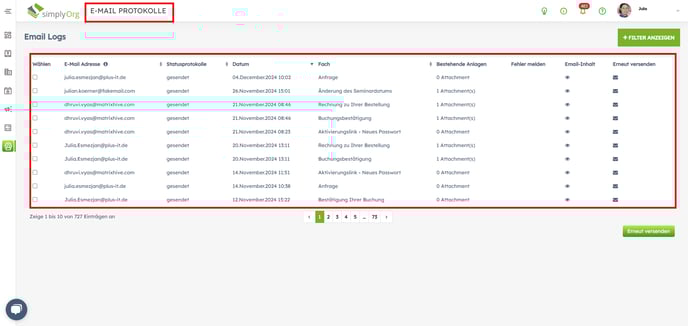 Die E-Mails, die automatisiert über einen Workflow versendet werden, sind im Modul "E-Mail Protokolle" im Bereich der "Administration" zu finden.