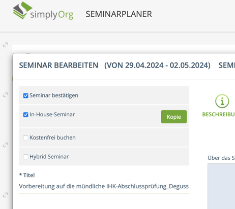 Der Link dient zur Freigabe der Buchung von Inhouse Seminaren, da diese nicht im Portal selbst veröffentlicht werden. Der Button erzeugt einen Link, der versendet werden kann. Über diesen dann versandten Link kann eine Buchung für diese Inhouse Seminare stattfinden.