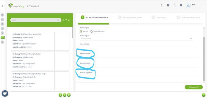 Im Rechnungsmodul im simplyOrg Backend können folgende Felder manuell und individuell gepflegt werden: Bestellnummer, Bestellposition und Kontierungsobjekt. Dies sind Felder, die für die Abrechnung in SAP genutzt werden können, und haben damit einen vorbereitenden und funktionalen Zweck. Via Schnittstelle werden diese Felder ausgelesen und an SAP übermittelt wo sie dann in die dafür vorgesehenen Felder eingepflegt werden. Dies gilt auch für Rechnungsvorlagen, die Ihnen von simplyOrg individuell erstellt wurden.