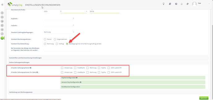 In der Administration des simplyOrg Backends unter "Einstellungen Rechnungswesen" im Menüpunkt "Online-Zahlungseinstellungen" kann eine (oder mehrere) der fünf angebotenen Zahlungsmethoden jeweils für registrierte Nutzer oder Gäste gewählt werden.